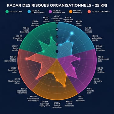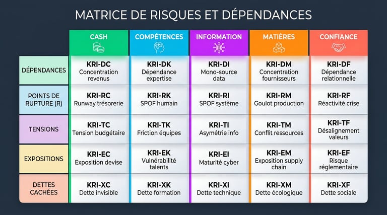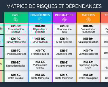 Matrice 5×5 analysant les flux vitaux de l'organisation croisés avec ses zones de vulnérabilité. Chaque intersection génère un KRI (Key Robustness Indicator).